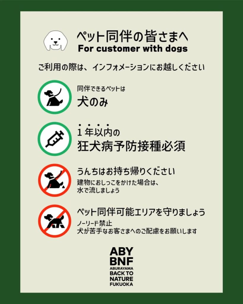 ABURAYAMA FUKUOKA(牧場エリア)を利用の際は、 1年以内に狂犬病予防注射の接種が必須です。 当日は狂犬病予防注射票を必ずお持ちくださいね。