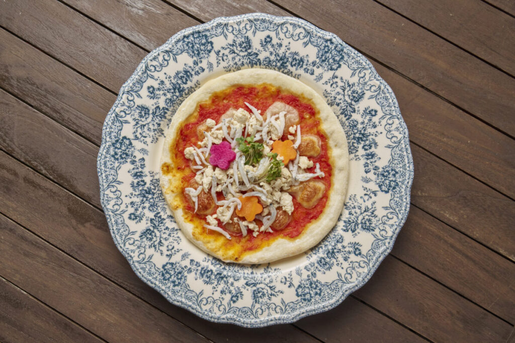 ひとつめのメニューは、トッピングに犬も食べられるチーズを使用した「わんわんピザ」1,111円(税込)。鶏肉やしらす、地元野菜をふんだんに使用したマルゲリータです。