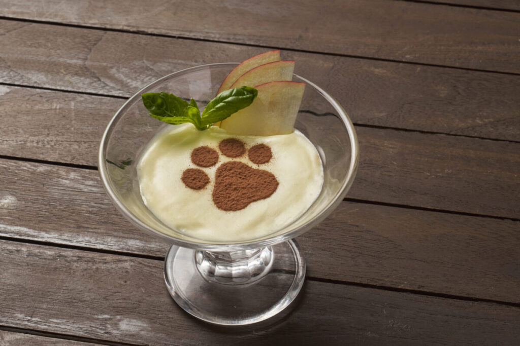 もうひとつのメニューは、豆腐やおからパウダーを使用した「わんわんティラミス」864円(税込)。キャロブパウダーで描いた肉球マークのデコレーションが、とってもキュート♪