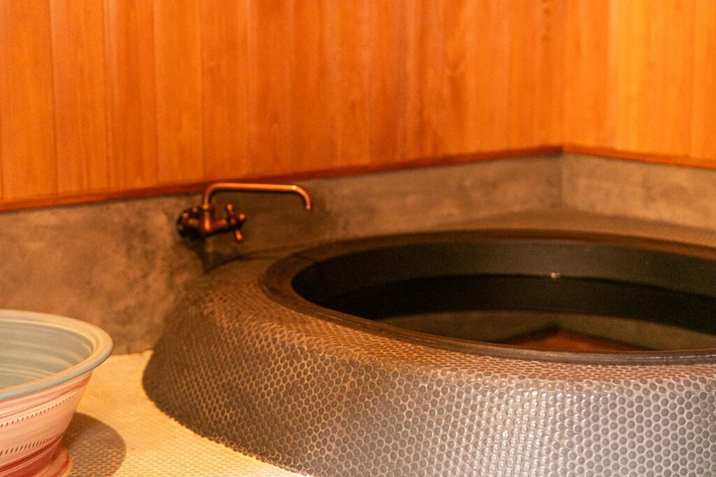 薪をくべて入る五右衛門風呂では、鋳物ならではの遠赤外線効果や、溶け出す鉄分による肌触りの良いお湯を心ゆくまで堪能できます。