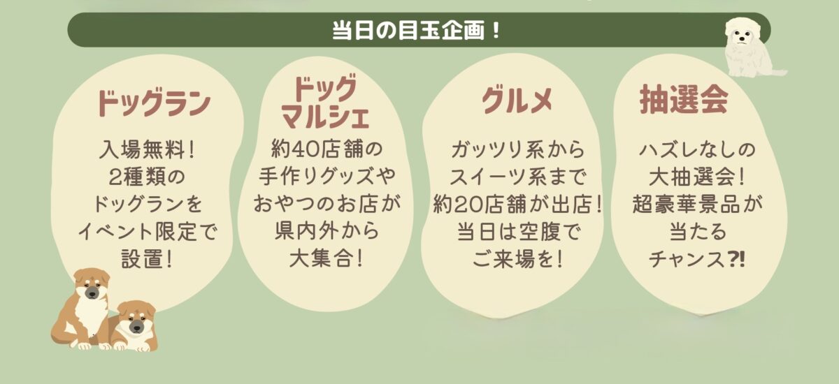 さらに、犬種ごとに集まれる『犬種別オフ会』、飼い主と愛犬が一緒に走れる『ドッグレース』、先着500名に必ず何かが当たる『抽選会』など、多彩な企画が用意されています♪