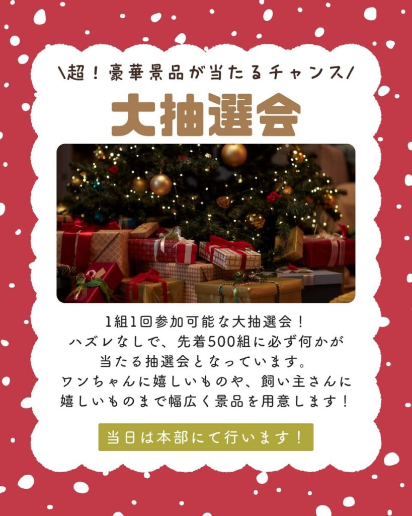 毎回大人気の『大抽選会』は、犬のおやつやおもちゃ、当日使える割引券など、先着500組に必ず何かが当たる“ハズレなし”の抽選会です。