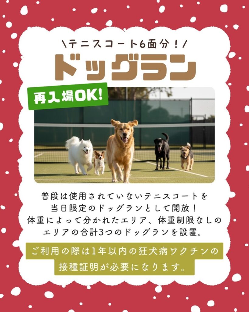 普段は使用されていないテニスコートを、イベント当日限定で『ドッグラン』として開放します。広さはなんと、テニスコート6面分!