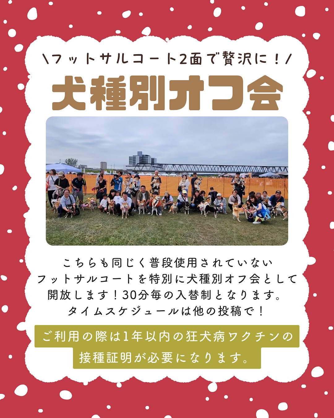 ※犬種別オフ会の参加には、1年以内の狂犬病ワクチンの接種証明書が必要です。