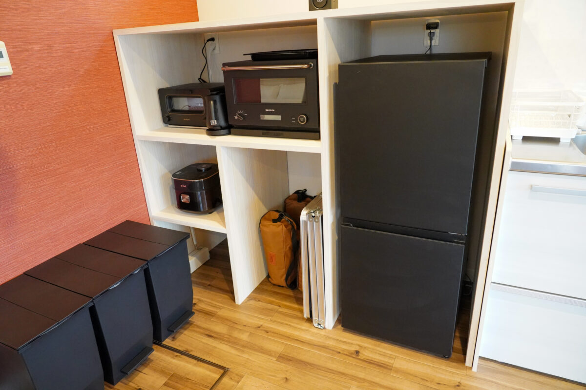 ダイニングスペースには、冷蔵庫やIHコンロ、電子レンジ、トースター、炊飯器までそろっていて設備も充実。食材を持ち込んで自由に過ごせるので、連泊でも不便を感じることなく快適に滞在できそうです。