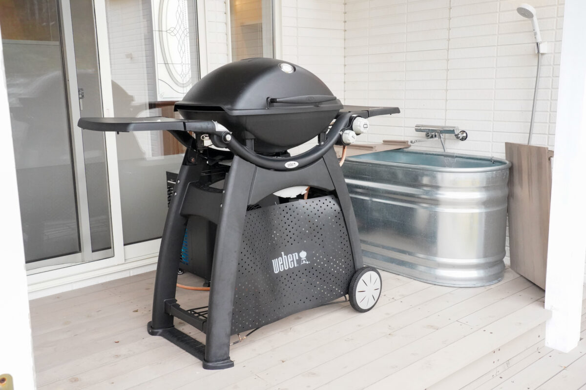 夕食は、ウッドデッキでBBQ。 用意されているのは、火力が安定していて「初心者でも失敗しにくくおいしく焼ける」と評判の本格派のガスグリル「Weber(ウェーバー)Q3200」です。