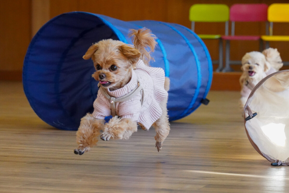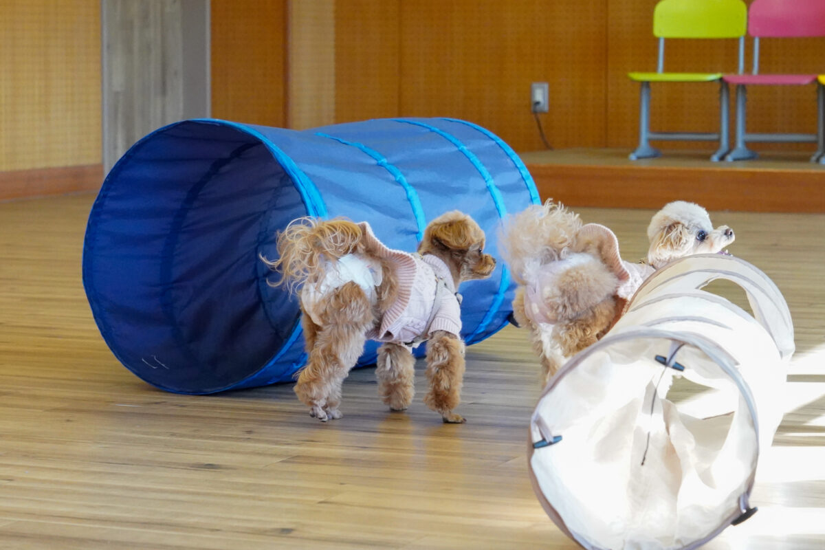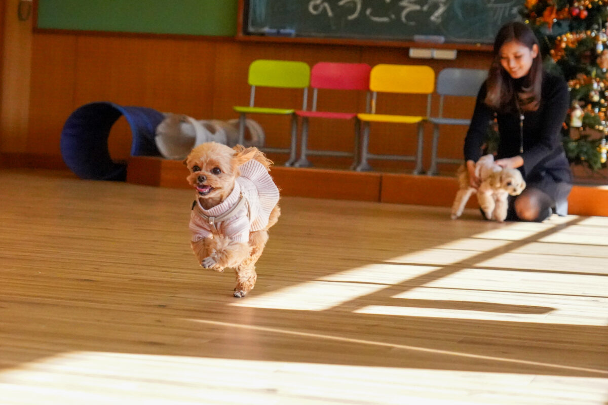 天候や気温に左右されず楽しめる室内ドッグランは、なんと元・音楽室。窓から差し込む明かりが気持ちよい広々とした空間で、ロコちゃん&モコちゃんものびのび過ごせました。