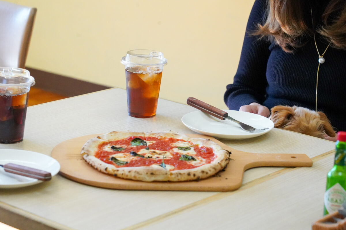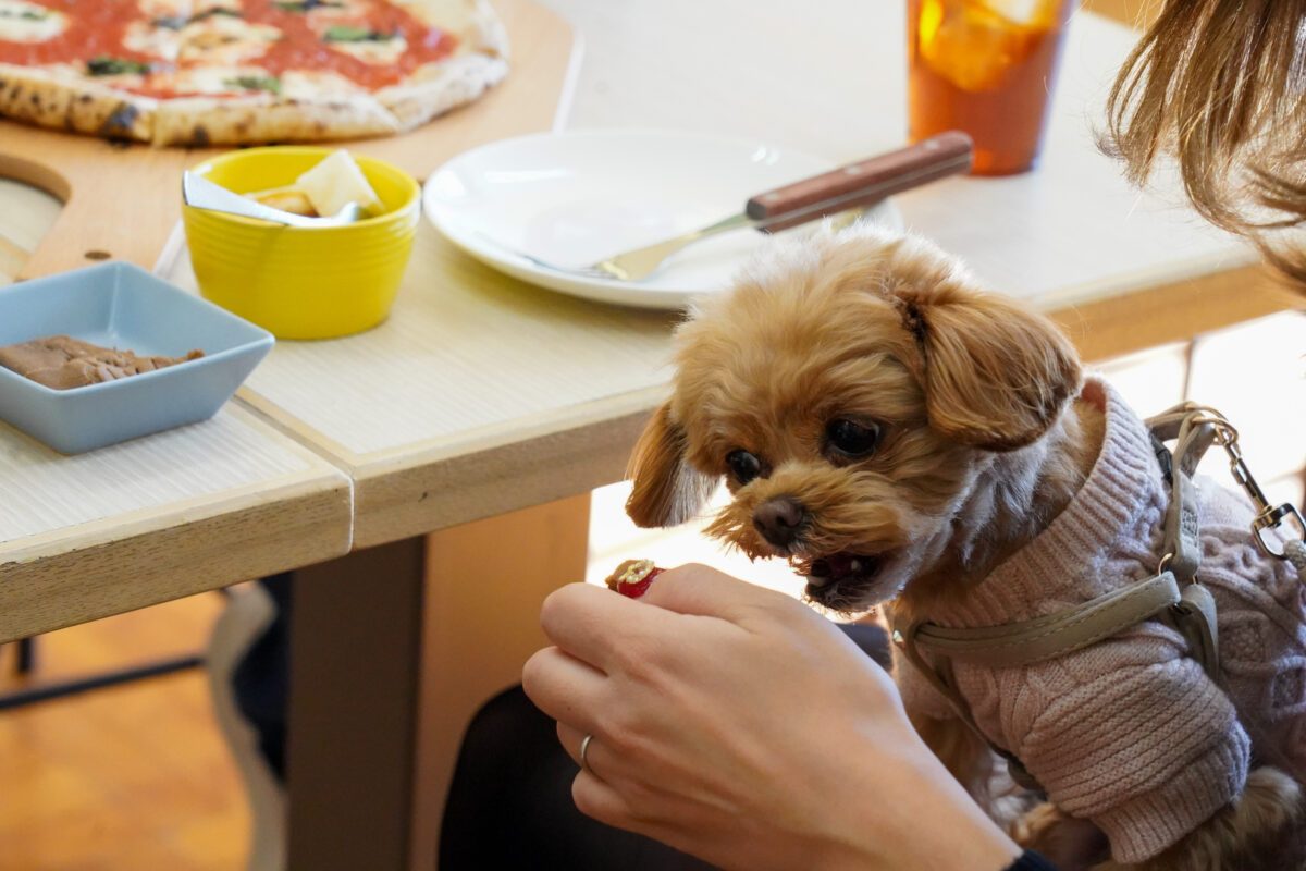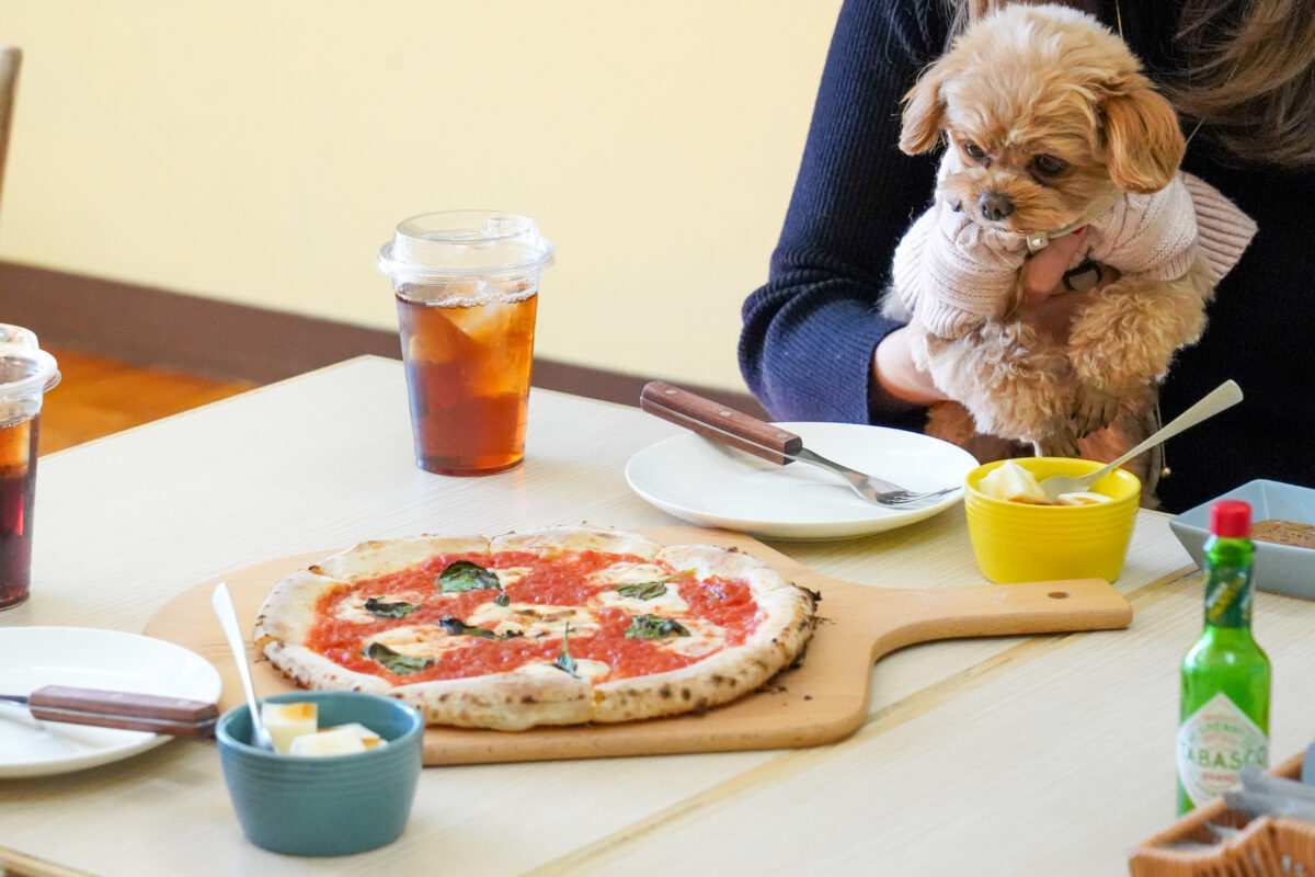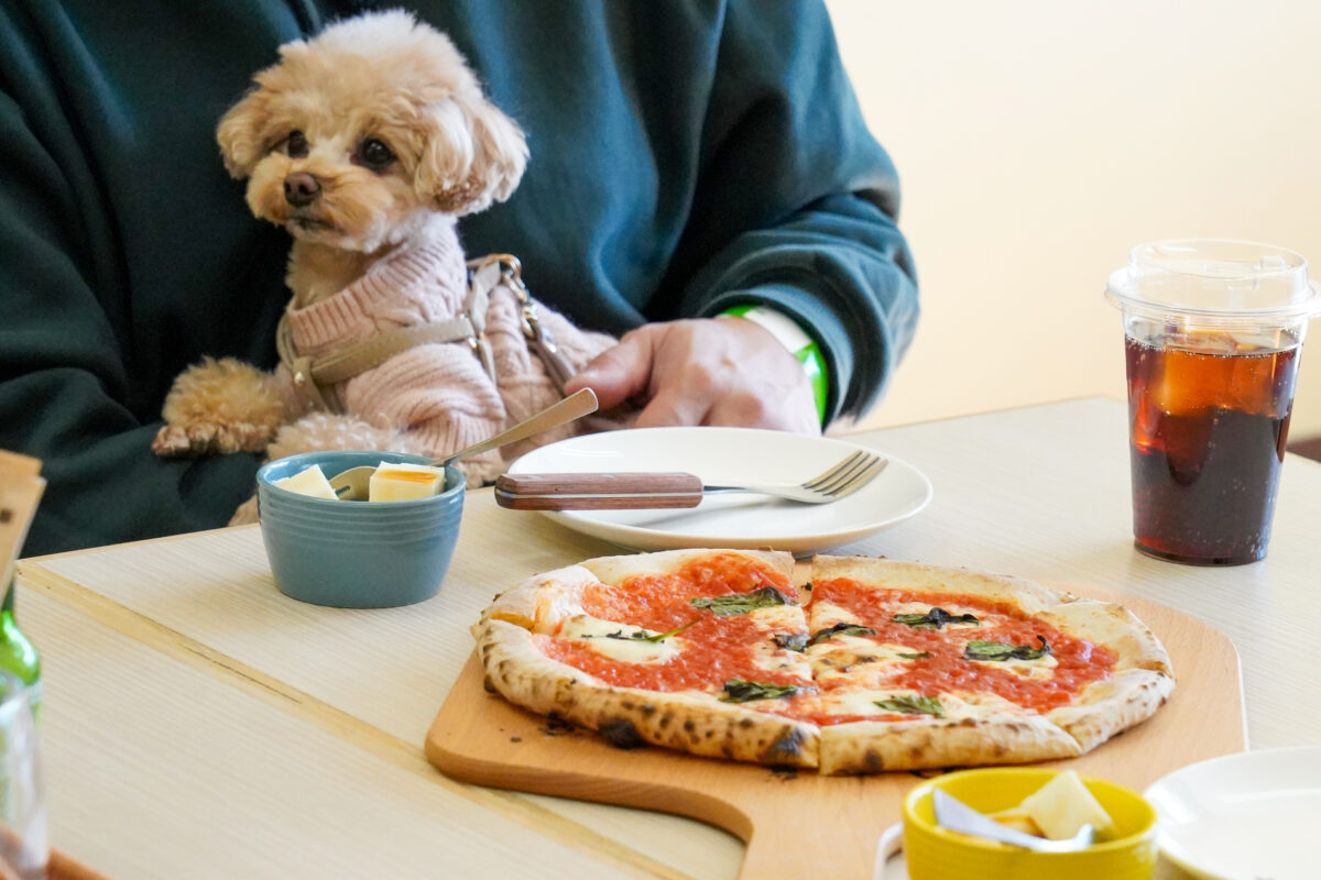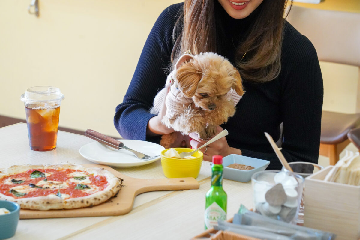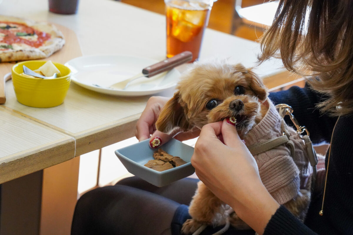 お昼ごはんは、家庭科室の札がかかった教室(ドッグカフェ)で。ピザやサンドイッチなどの軽食を、愛犬と一緒に楽しめます。米粉やヤギミルクなど、わんこにやさしい素材で作ったドッグスイーツもありますよ♪