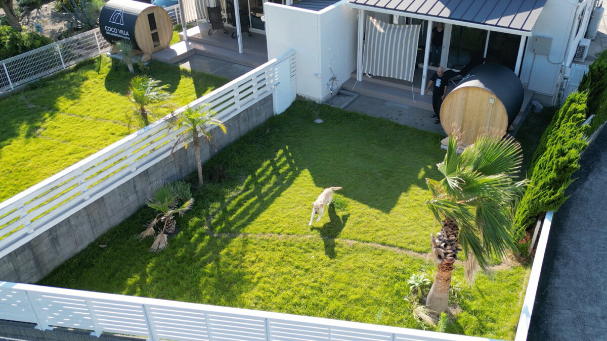 ダイニングからそのまま出られるプライベートドッグランや、徒歩約1分で行ける海辺のお散歩コース、そして本格的なプライベートサウナやBBQなど、 わんこも飼い主さんも心地よく過ごせる滞在が叶います。