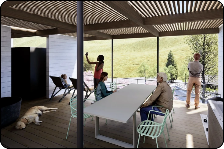 宿泊は難しいけれど、自然の中で愛犬とリラックスして過ごしたいという飼い主さんにおすすめなのが、家族や仲間と日帰りBBQを楽しめるプライベートテラス。屋根付きの半屋外空間なので、急な雨や強い日差しを気にせず、快適なBBQタイムを過ごせます◎