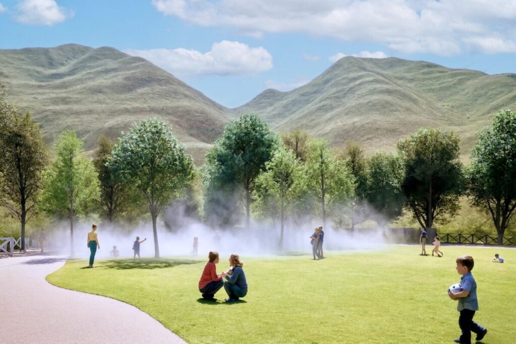 施設内には、子どもから大人まで自由にくつろげる緑豊かな芝生スペースや、これからの季節に嬉しい「ミストエリア」も。