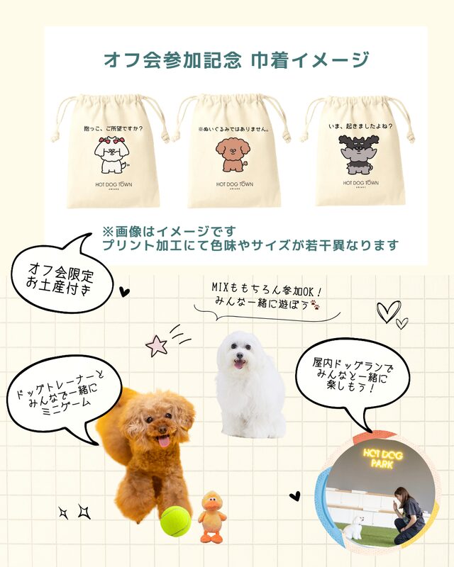 同じ犬種や同じカラーのわんこと、屋内ドッグランで交流できるオフ会も開催されます。ドッグトレーナーと一緒にミニゲームであそんだり、みんなで記念撮影をしたり、交流を楽しんだりと、盛りだくさんの1時間です♪