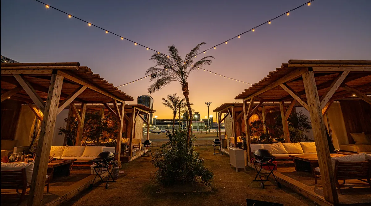 隣にある屋外ドッグランでいっぱい遊んだ後は、アメリカ・カリフォルニア州パームスプリングスをテーマにしてデザインされたアウトドア空間で、おしゃれなBBQでお腹を満たす、そんな過ごし方もおすすめです♪
