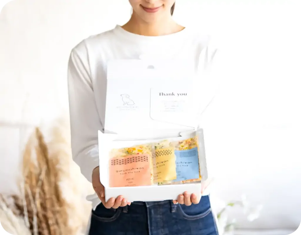 「グルメシワン」はヒューマングレードの食材を使用し、保存料・着色料・香料・酸化防止剤不使用の安心・安全のフレッシュドッグフードです。