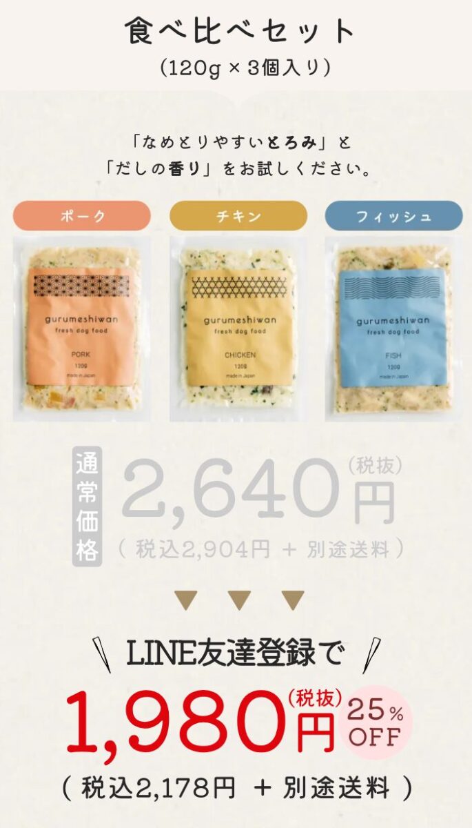 「グルメシワン」の食べ比べセットは、通常2,640円(税込 2,904円)+送料で販売されています。
