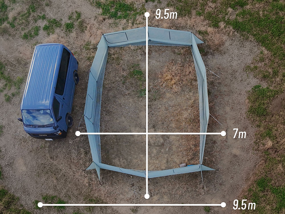 「ワンダーウォール」の設営に必要なスペースは、ロープを含めて約9.5×7m。10×10mの区画サイトなら、車1台とあわせてもすっきり収まるサイズ感です。