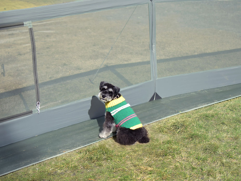 内側は約40㎡の広さがあり、ファミリー向けの大型ツールームテントも余裕をもって設営OK! テント周辺まで含めて安心できる空間になるので、愛犬はテントのまわりで遊んだり、飼い主さんのそばでゆったりくつろいだり、ノーリードでのびのびと過ごせます。