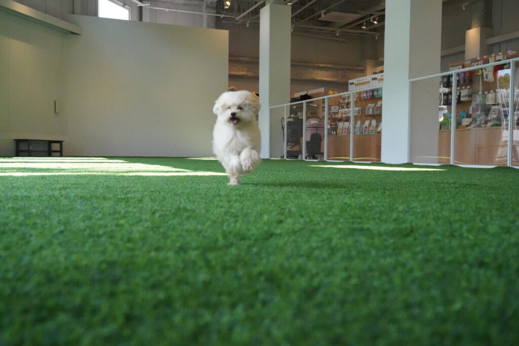 小型犬専用の室内ドッグランには、天然素材100%の土を敷き詰めた人工芝を採用。愛犬の足にもやさしい素材でできています。