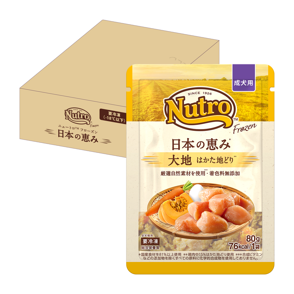 ■内容:「ニュートロ™フローズン 日本の恵み」2種(「山 鹿肉」「大地 はかた地どり※5」)×1パウチ(成犬用のみ)
