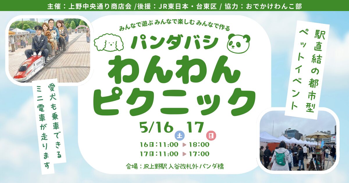 2026年5月16日(土) 〜 17日(日)の2日間限定にて開催予定の「パンダバシ わんわんピクニック」は、ペットイベントだけではなく、モリとマチとエキがつながる空間づくりとして、上野中央通り商店会主催、JR東日本・台東区後援にて実施される公共区間等の新たな活用や、居心地の良い空間をテーマにした実証実験でもあります。