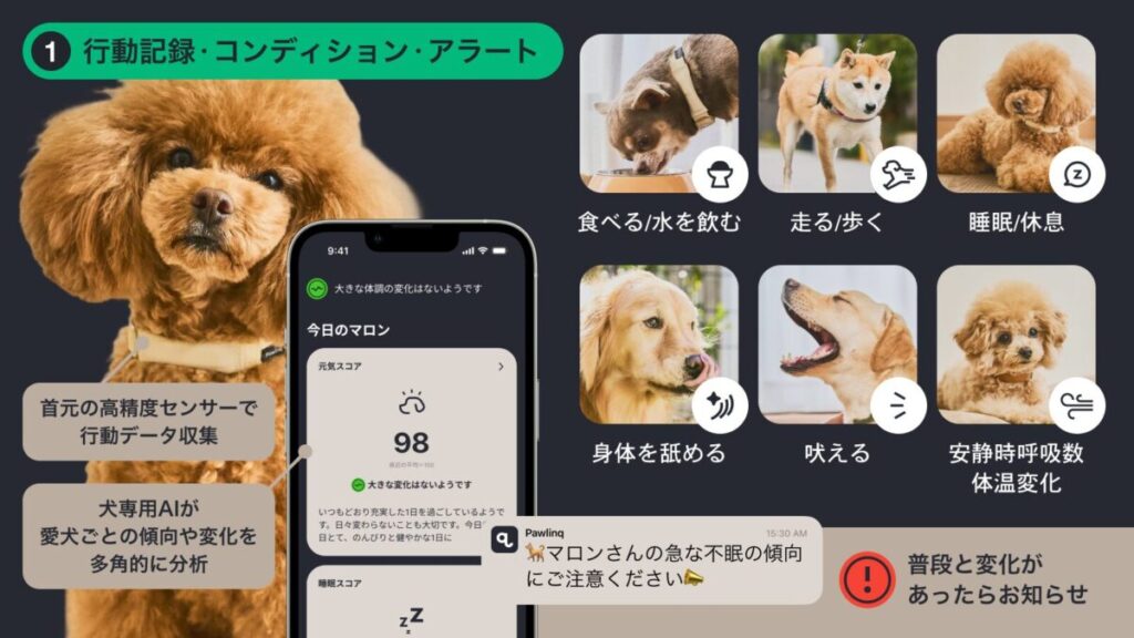 毎日のデータから、愛犬の行動パターンや体調の変化をAIが自動で解析してくれるアイテムということで、詳しくご紹介します。