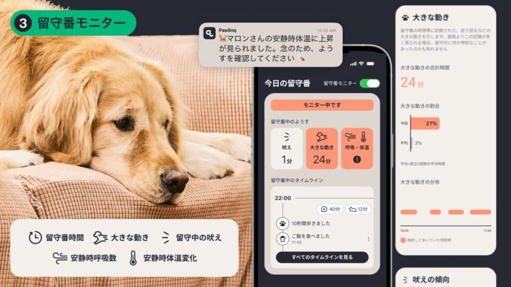 「Pawlinq」には、普段と変化があったときに知らせてくれる機能も搭載されています。見えづらい体調変化に気づくきっかけになるのは、飼い主さんにとって心強いサポートになりますね◎