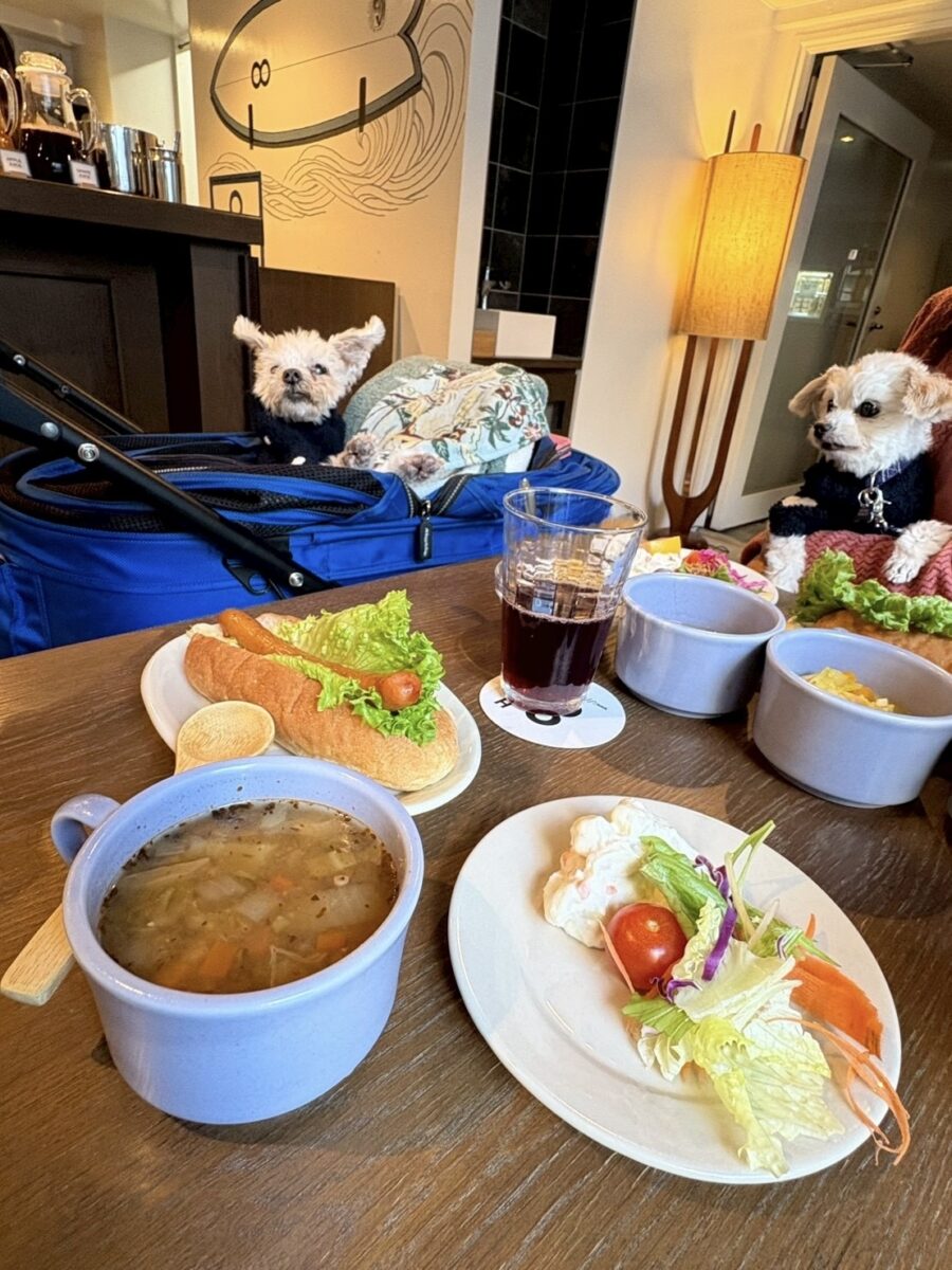 わんこも泊まれる8HotelのCafeが宿泊者以外もmorningが食べれるようになりました。 ホットドッグかミニパン食べ放題を選んで、スープやサラダ、ドリンク類のハーフビュッフェスタイルです。 居心地のいい店内で、朝7:00〜ゆっくり食べれるのが嬉しいです。