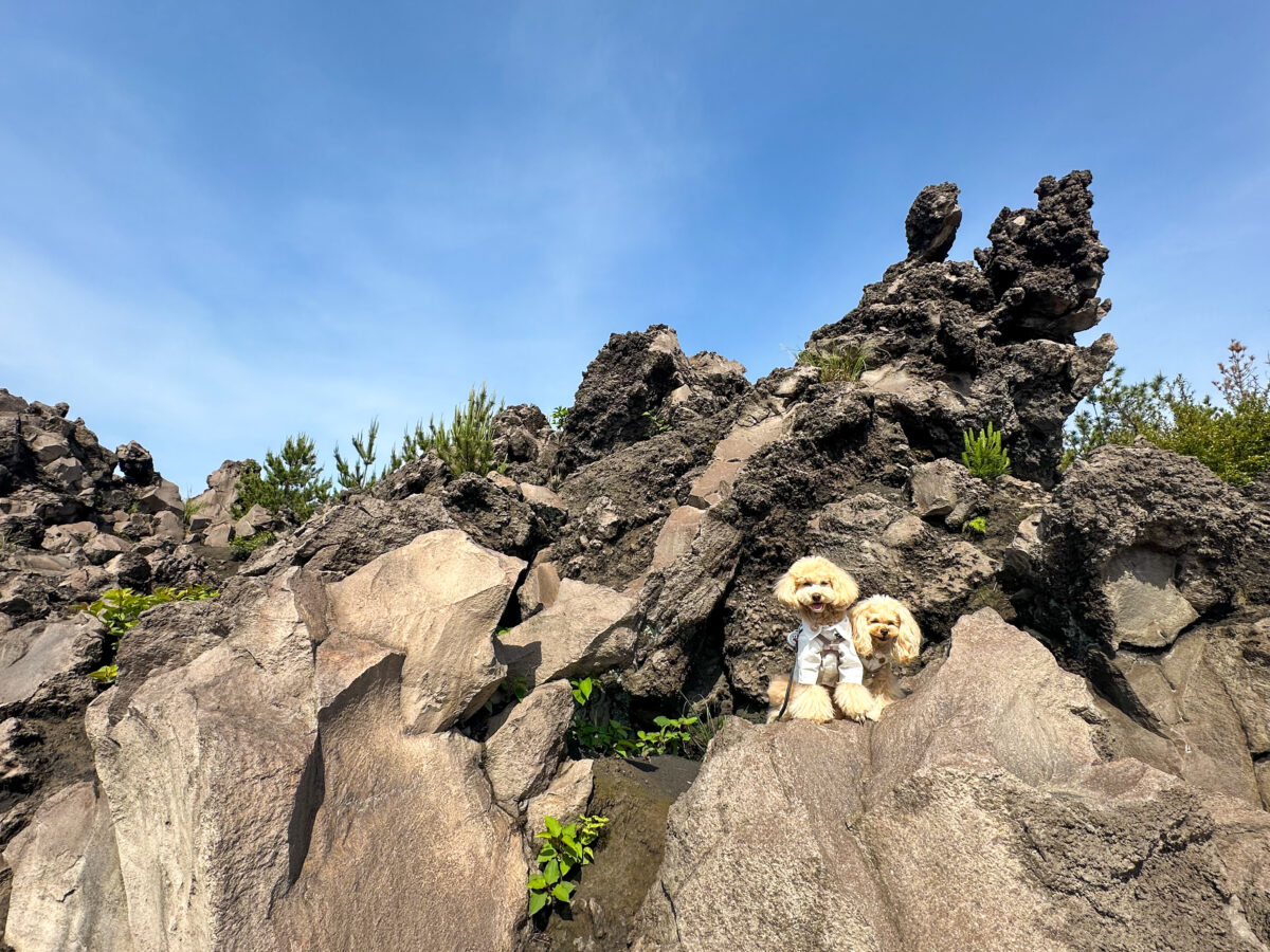 ゴツゴツの黒い溶岩原の迫力がすごかった! 溶岩と桜島を一緒に撮影できるフォトスポットがあって、非日常空間に来ているな、と感じられる場所。 約1キロの遊歩道が整備されていて、朝んぽにちょうどよかった♪ ティナは溶岩の岩がお気に入りで中に入って伏せてくれちゃって、もれなく火山灰だらけになったのも思い出!