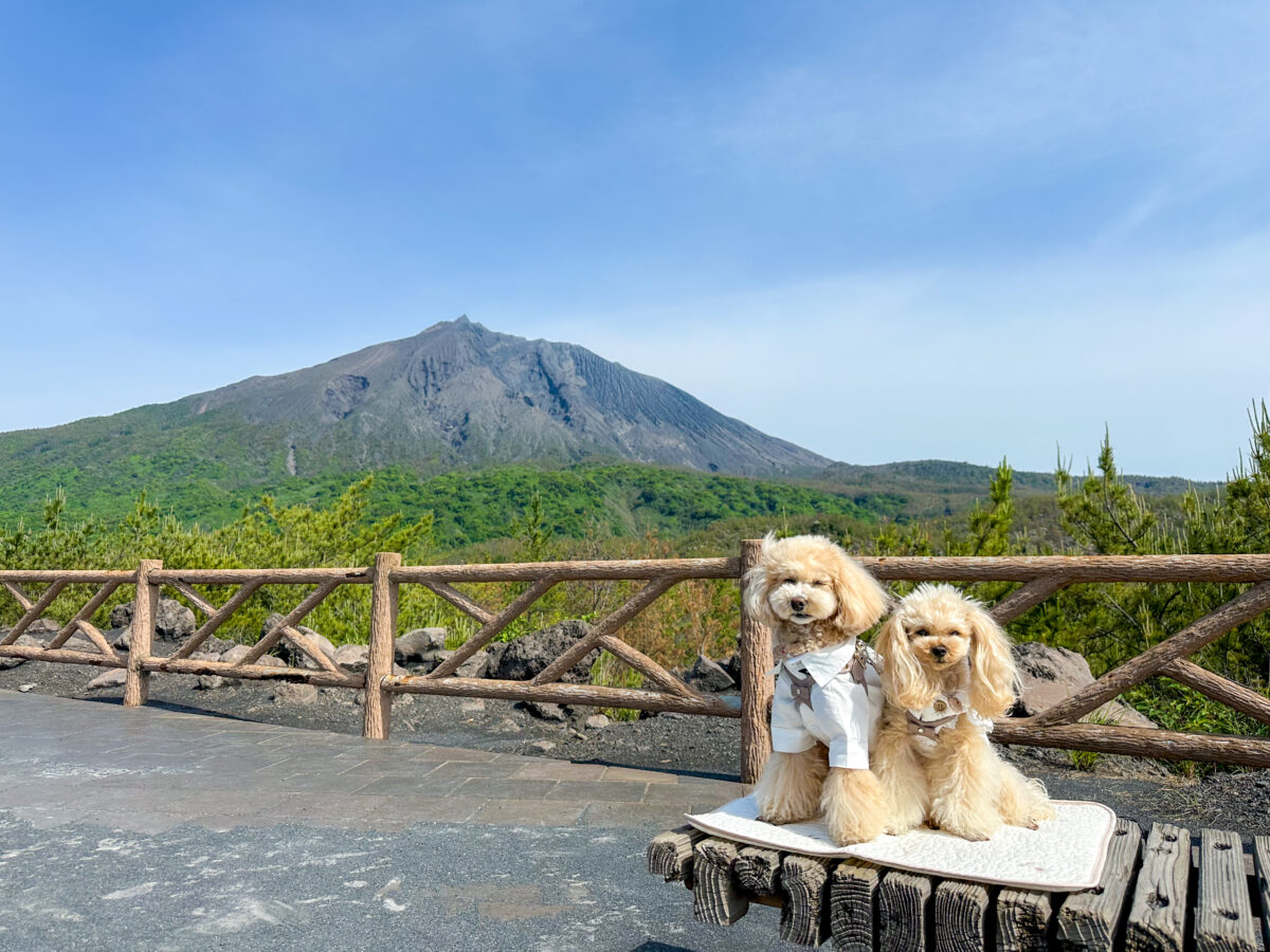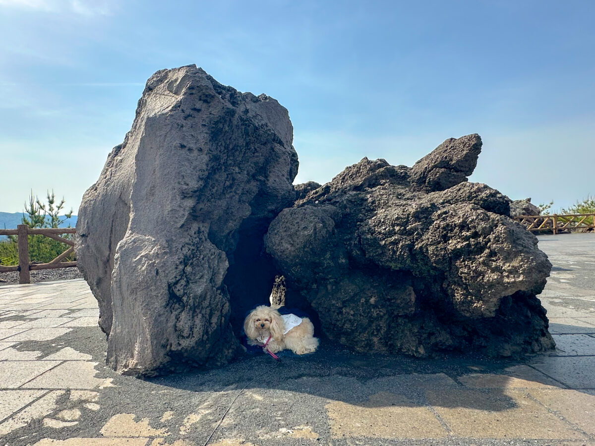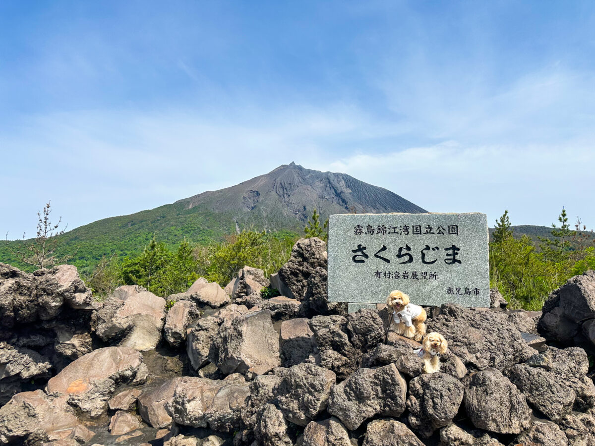 ゴツゴツの黒い溶岩原の迫力がすごかった! 溶岩と桜島を一緒に撮影できるフォトスポットがあって、非日常空間に来ているな、と感じられる場所。 約1キロの遊歩道が整備されていて、朝んぽにちょうどよかった♪ ティナは溶岩の岩がお気に入りで中に入って伏せてくれちゃって、もれなく火山灰だらけになったのも思い出!