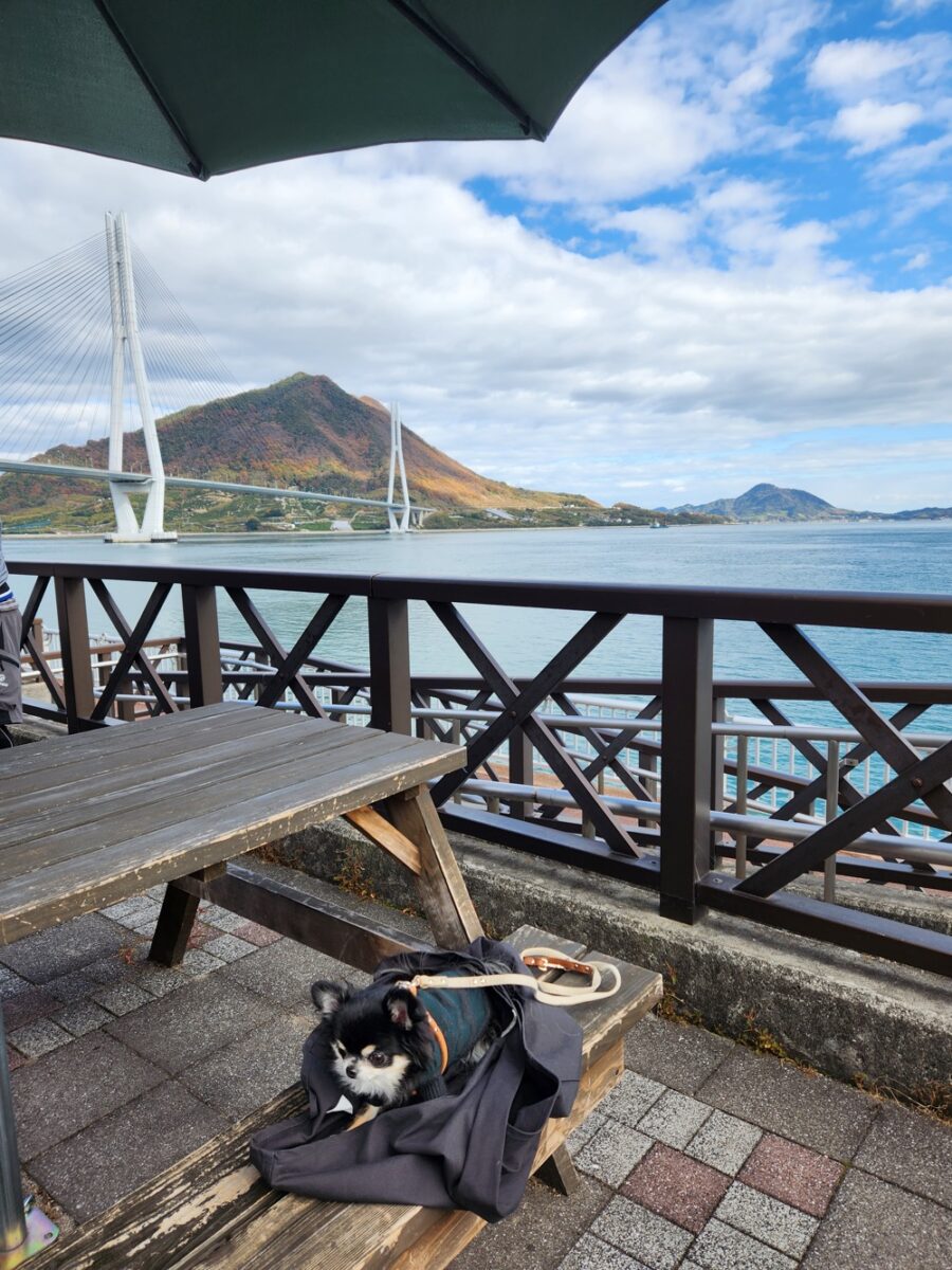 くうたんちゃん、素敵なレポートをありがとう! くうたんちゃんのご家族からコメントが届きました! --------- しまなみ海道の大三島ICを降りてすぐの場所にあり、観光途中の休憩におすすめです。 地元の食材を使った和食レストランのテラス席はわんこOK! サイクリストの聖地と、世界でも有数の斜張橋「多々羅大橋」の景色は四国八十八景の58番に選定されています。瀬戸内海の景色を眺め、広場を散歩したり、ゆったりとした時間が過ごせました。 日本総鎮守「大山祇神社」へ行く際に立ち寄りましたが、農水産物の直売所や売店には地元の特産品があり、帰りにお土産を買って帰りました。