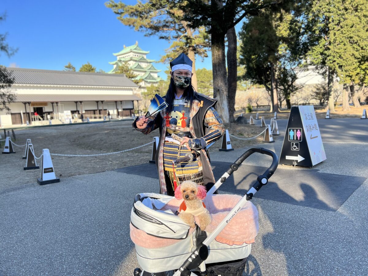 初めての名古屋城。 城に住むお侍さんが偵察に居ていたので記念撮影して頂きました! たくさんのわんちゃんもお散歩してたよ〜