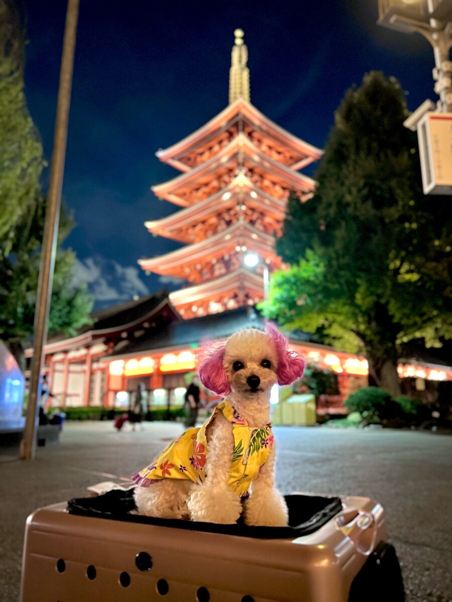 浅草寺はワンコ同伴可。 東京に訪れたら、健康を兼ねてご利益のある常香炉の煙をメイメイと一緒に浴びます。 また夜の浅草寺は人が少なく、ライトアップもあるので個人的にオススメ!
