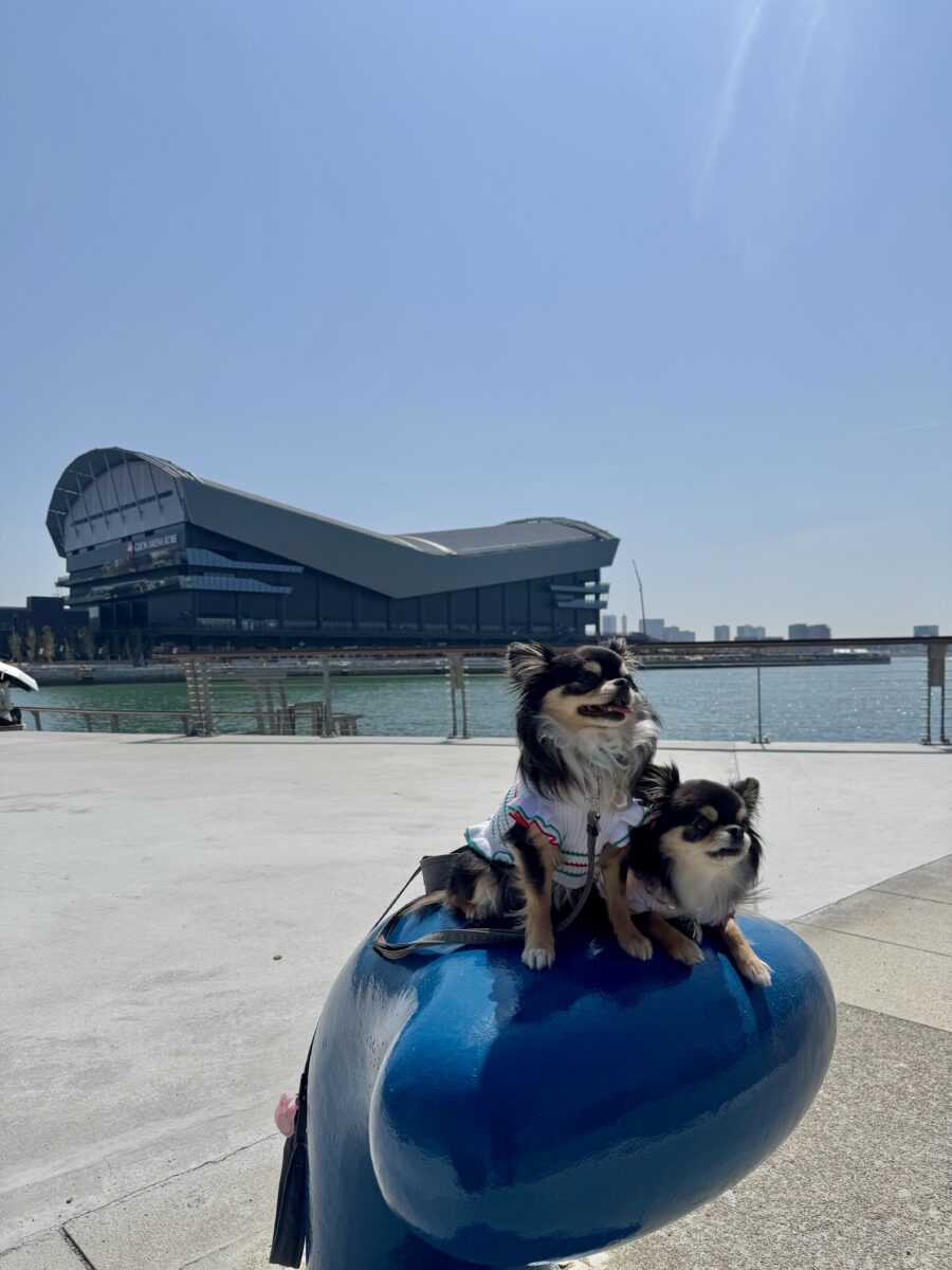 神戸のウォーターフロントエリアの中でも海が近くて海風が心地よく、奥の芝生エリアも綺麗でした。 ジーライオンアリーナ神戸はテラス席わんこOKのカフェもたくさんあり、すぐ近くにあるNEW SEA PORTエリアと合わせて突堤をお散歩するのもお勧めです。