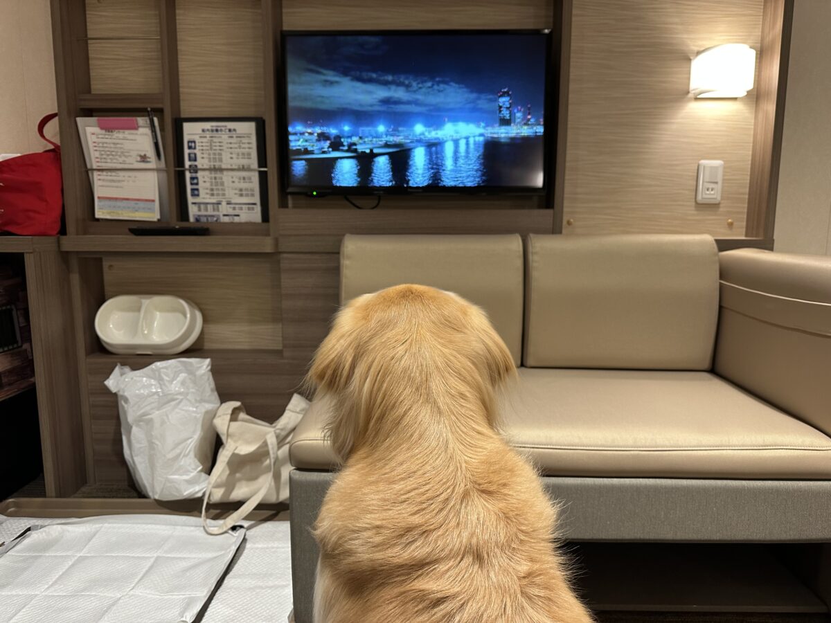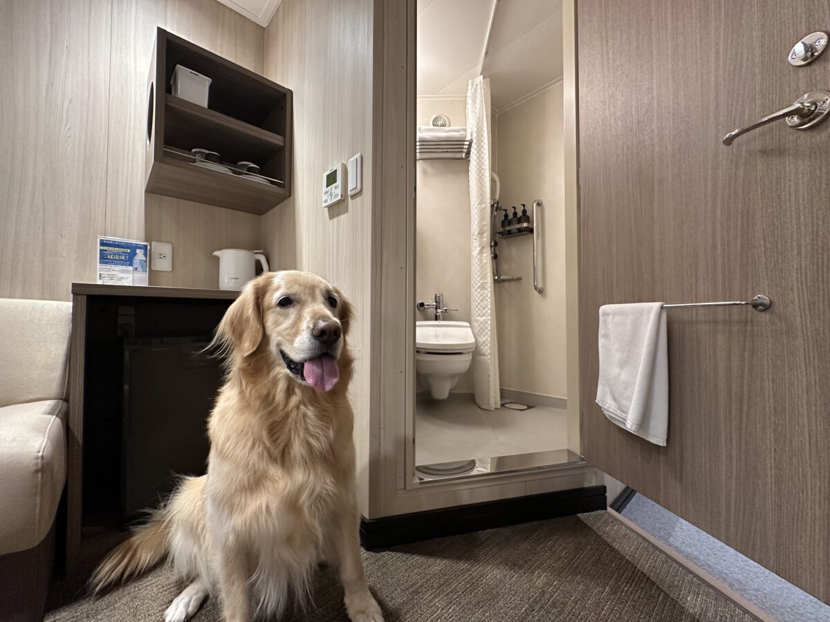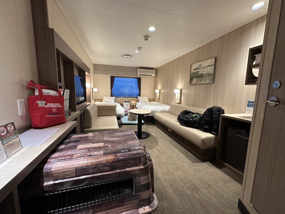 人間用のアメニティも充実しており、ソファーやふかふかのベット、テレビや窓がある事でリラックスができ、快適な船旅に。また室内の防音がしっかりしていて、他の部屋の子達の鳴き声も聞こえませんでした。