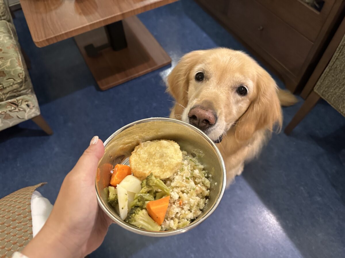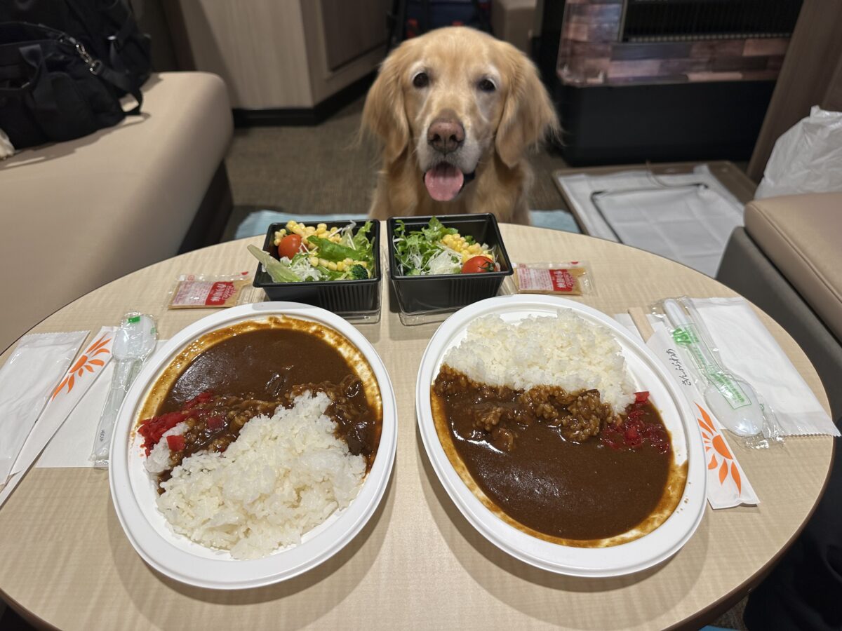 モコちゃん家族が初日の夕食に選んだのは、テイクアウトメニュー。レストランの看板メニューでもあり、ファンも大勢いる“名物・さんふらわあカレー”をいただきました♪