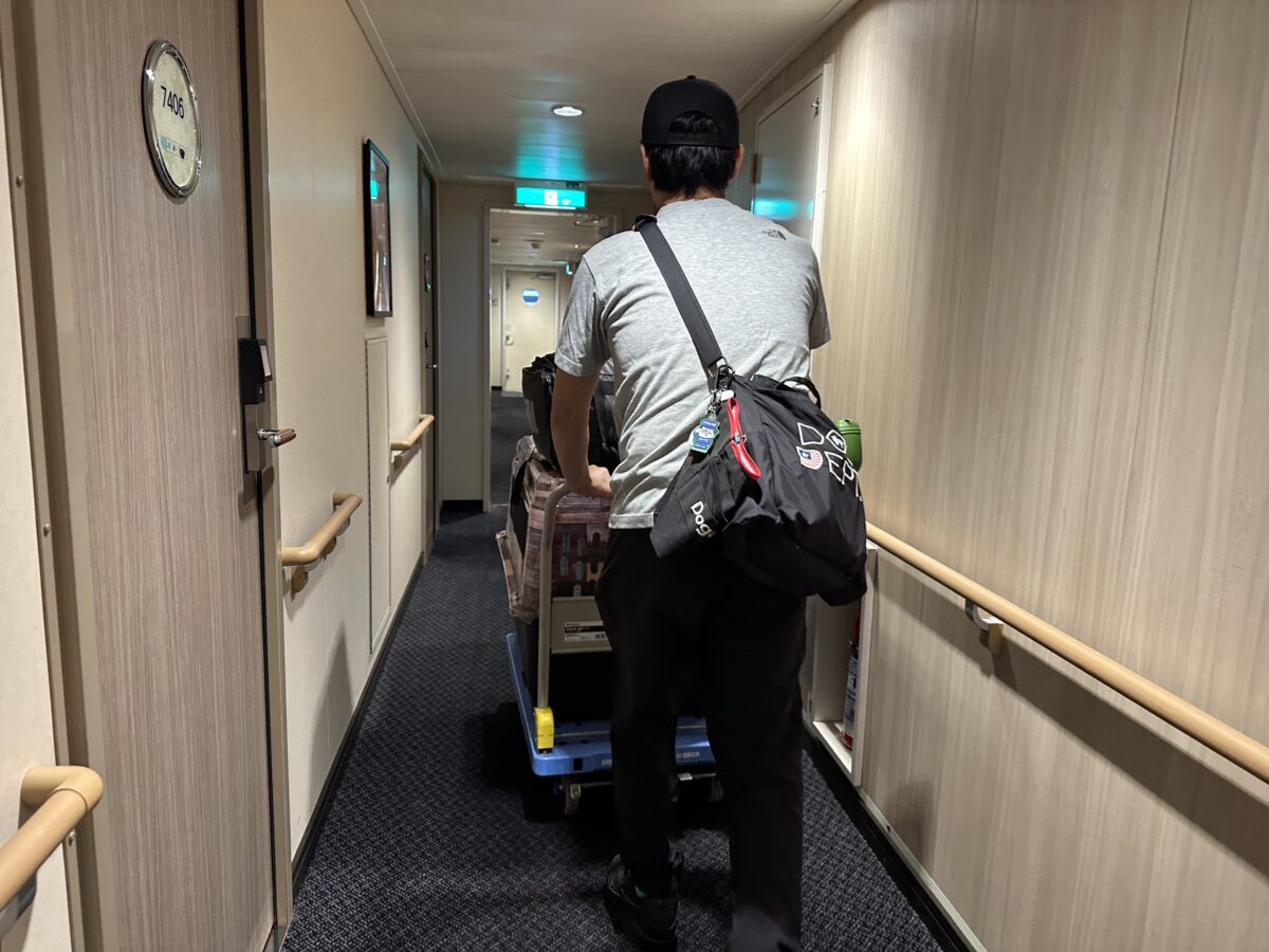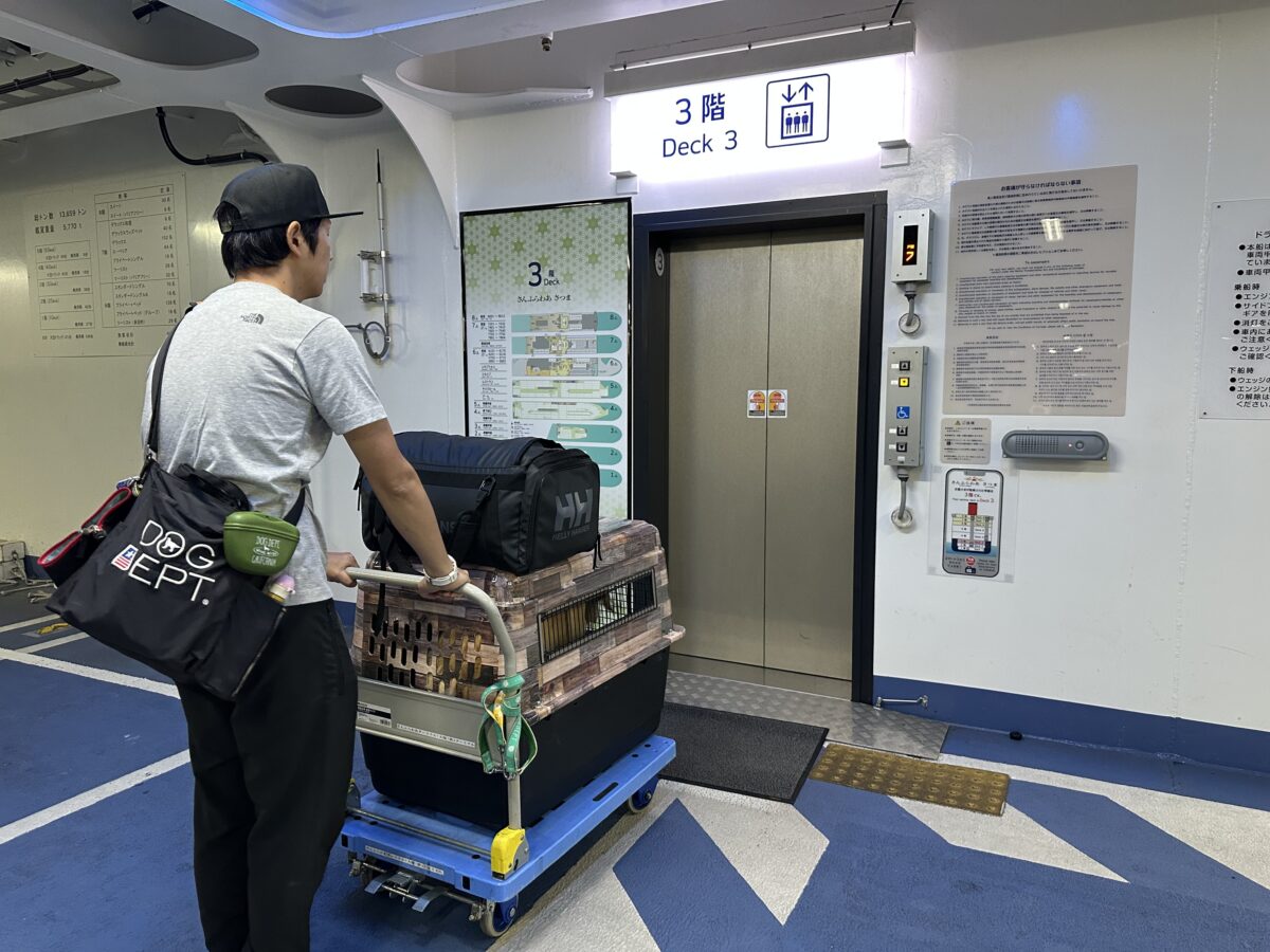車からペットルームまでほぼ専用の廊下になっており、船上員の方が案内して下さるので迷わずスムーズに移動。台車の置き場所なども丁寧に説明して下さって安心でした。