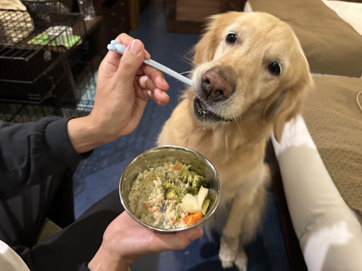家族だけのプライベートな空間のなかで、愛犬と一緒に食べる夕食は格別!お腹も心も満たされそうですね。