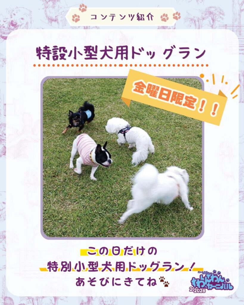 4/10(金)のみの特別企画、小型犬専用の特設ドッグランが登場!人工芝を使用しており、わんちゃんの足にも優しい環境が整っています。