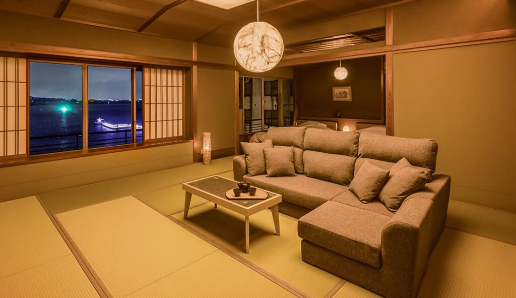 柴山潟のほとりに広がるお部屋は、すべての客室がレイクビューを臨む配置に。