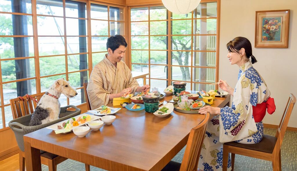 滞在中は、愛犬も同伴OKのお食事処で、四季を感じる山海の幸を存分に使用した、料理長こだわりの会席料理を心ゆくまで味わえます。