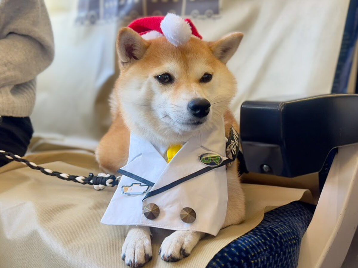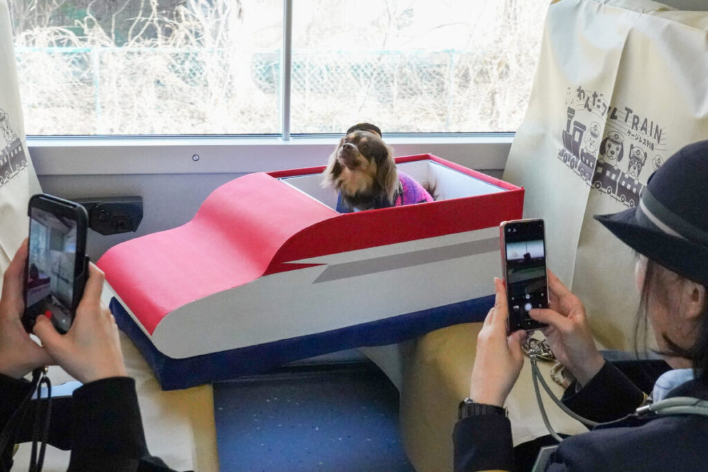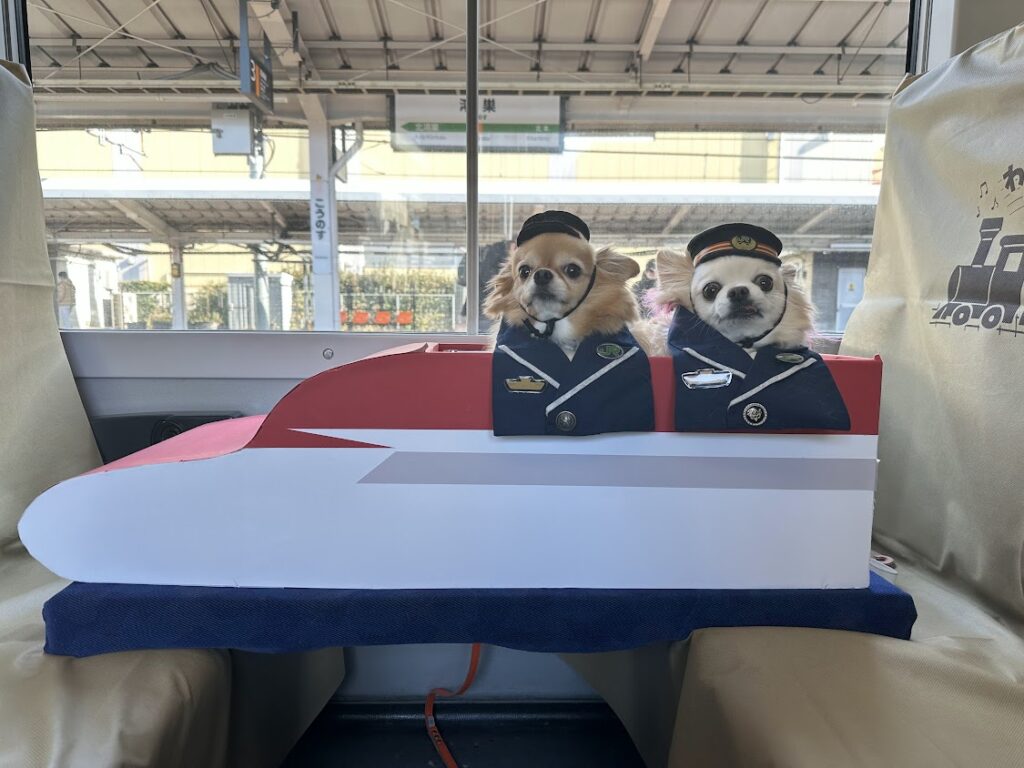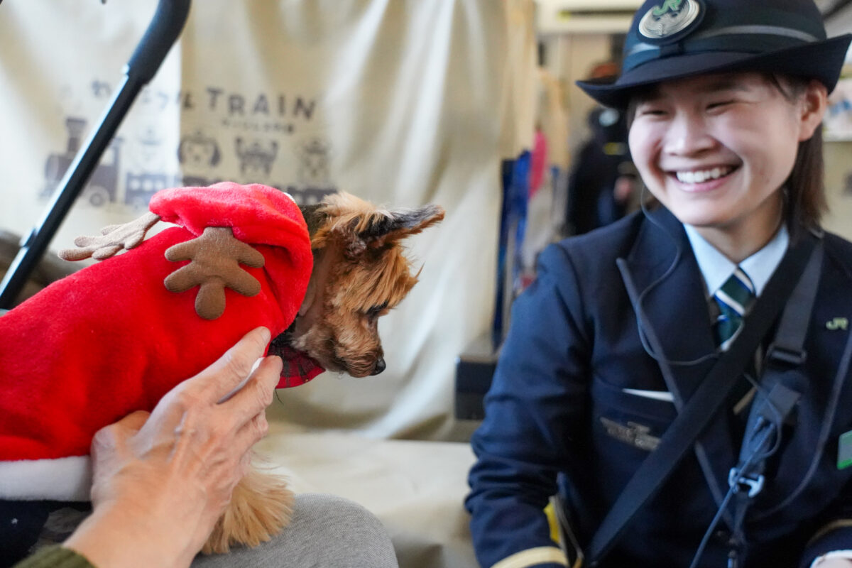 出発後の車内では、JR社員さんが笑顔でわんこと交流を楽しむ姿も。一緒に写真を撮ったり、お話ししたり。JR社員さんのやさしい雰囲気に、わんこたちも安心して過ごしていました。