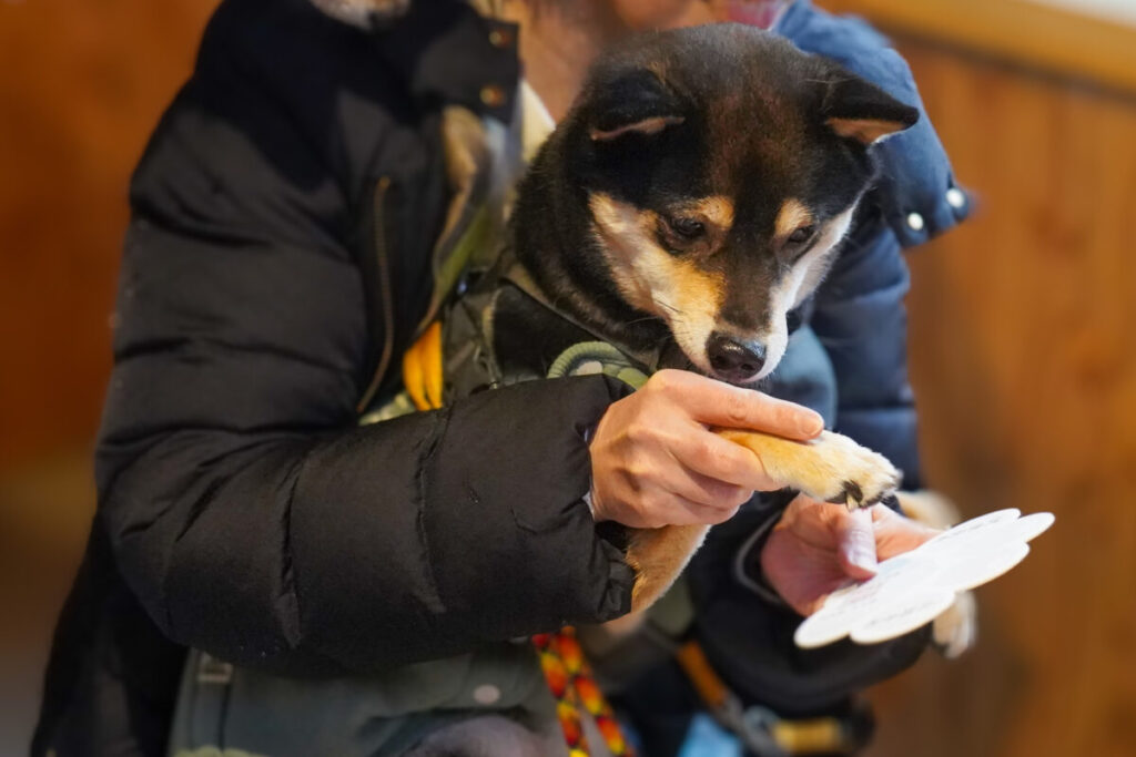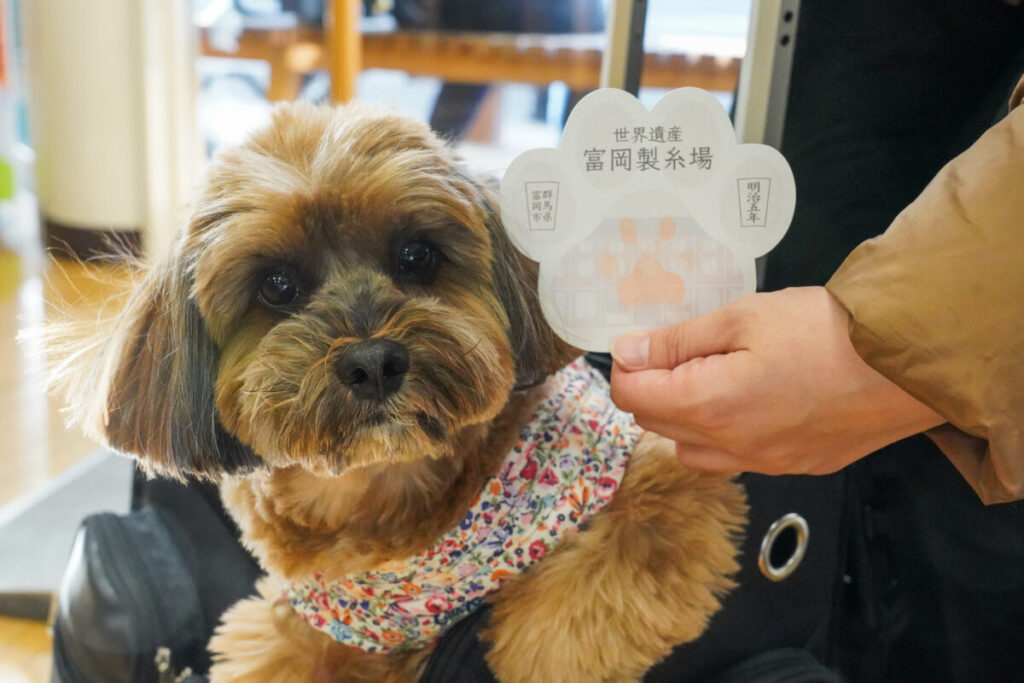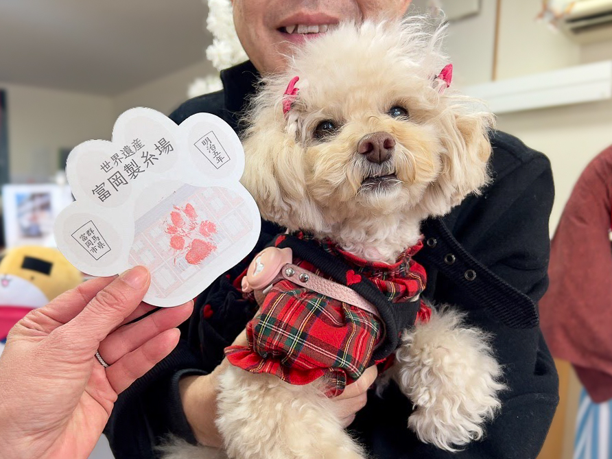 見学後は、オリジナルデザインの台紙に愛犬の肉球スタンプが押せる「富岡肉球スタンプ」に挑戦するわんこも。みんな、とっても上手に押せました♪