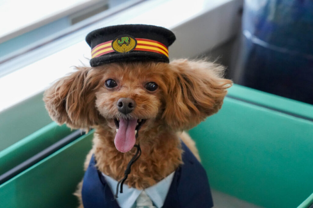 毎回大人気の、JR制服&制帽記念撮影会。今回も、わんこ専用に作られたオリジナルのJR制帽と制服(前掛け)を身につけて記念撮影を楽しみました。