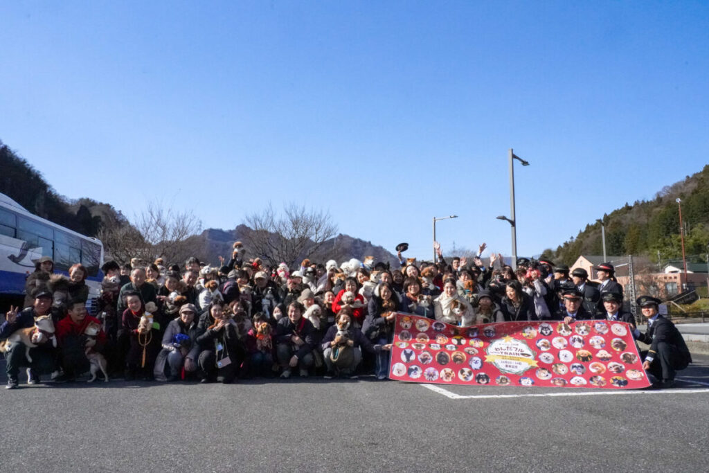 出発時には、参加わんこたちがプリントされた乗車記念の横断幕を前に、JR社員さんが手を振ってくれました。笑顔と愛情いっぱいのお見送りに、わんこも飼い主さんも大感動!
