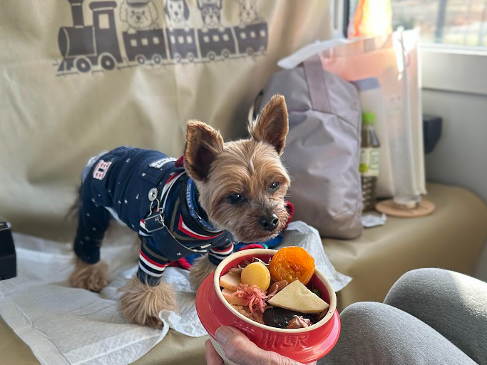 愛犬と飼い主さんが、一緒に味わうランチタイム。ケージレス列車だからこそ叶う、旅の思い出に残る、あたたかくて特別なひとときとなりました。