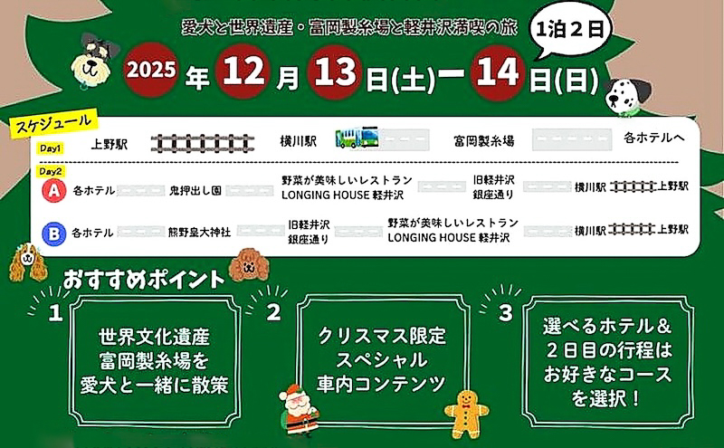 さらに、2日目午前の行程を2パターンご用意し、初めての方もリピーターの方もお楽しみいただける内容といたしました。わんちゃん同士の交流だけでなく、「電車で一緒に旅をする特別感」を感じていただけるよう工夫を重ねております。
