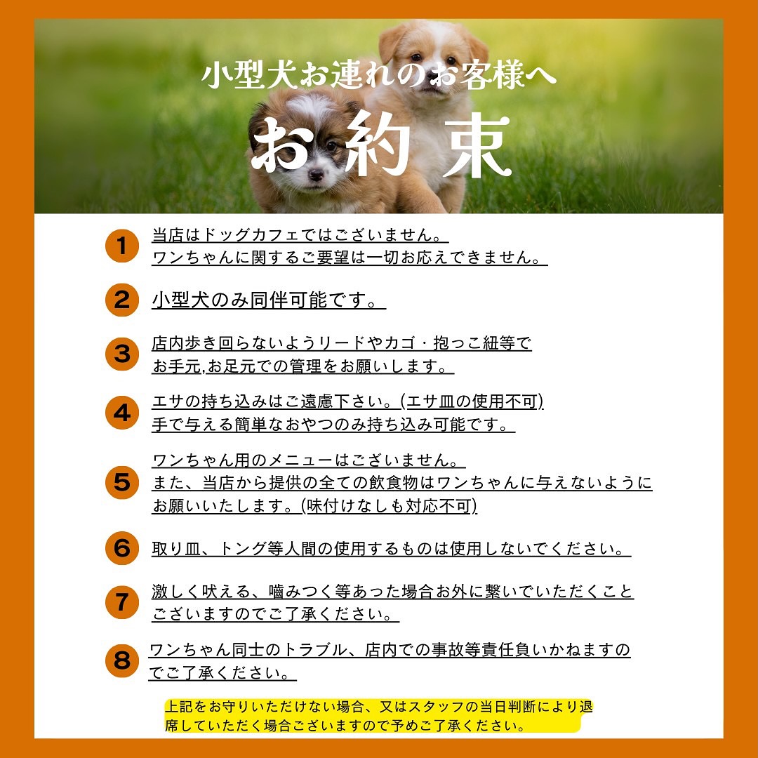- 愛犬は小型犬は店内同伴OK!中大型犬はテラス席のみ同伴OK!